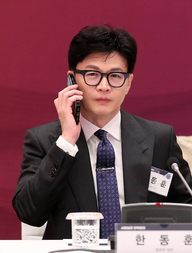 | ▲ 한동훈 법무부 장관이 5월 31일 청와대 영빈관에서 윤석열 대통령 주재로 열린 사회보장 전략회의에서 전화통화를 하고 있다. |