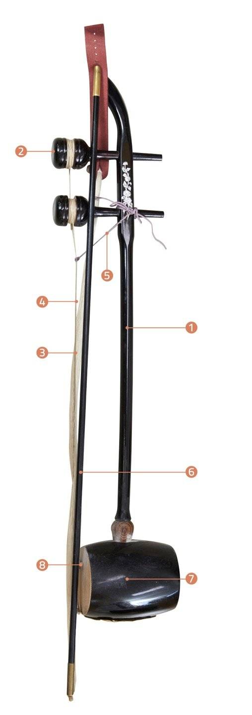 복판의 위에서 1/3지점에는 두 개의 줄이 지나가는 작은 나뭇조각이 붙어있는데, 이것은 복판과 줄 사이에 공간을 만들어 주는 원산(遠山)입니다. 줄을 활로 켤 때 발생하는 진동을 몸통으로 전달해 음량의 크기를 조절하는 역할도 하죠. 줄을 따라 올라오면 입죽의 상단에 줄을 감아 고정하는 두 개의 장치가 있어요. 이 줄감개를 주아(周兒)라고 하며, 돌리거나 풀어 조율합니다. 주아에 건 두 줄을 실로 묶어 입죽에 고정해 탄성을 더하는 끈은 산성(散聲)이라고 해요.