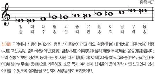 국악에도 서양음악처럼 한 옥타브 내에 12개의 음이 있어요. 황종(黃鐘)·대려(大呂)·태주(太簇)·협종(夾鐘)·고선(姑洗)·중려(仲呂)·유빈(蕤賓)·임종(林鐘)·이칙(夷則)·남려(南呂)·무역(無射)·응종(應鐘)이 그 주인공으로, 통틀어 십이율이라 부르죠. 서양음악에서는 오케스트라 합주 시 오보에의 A음(라)을 기준점으로 삼아 여러 악기를 조율하는데요. 국악에서는 합주 시 대금 등의 악기가 내는 임종을 기준점으로 잡으며, 이 음은 서양음악의 Bb음과 비슷해요.