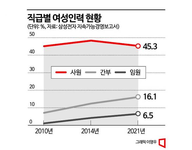 이재용 회장 경영 참여 이후 여성 임원 비중이 커진 점도 주목할 부분이다. 삼성전자는 창사 54년 만에 처음으로 올해 여성 사장을 배출했다. 이영희 DX(소비자가전·모바일) 부문 글로벌마케팅실장을 사장으로 승진시켰다. 삼성전자 여성 사원 비중은 2010년 45.1%, 2014년 48.3%, 2021년 45.3%로 비슷했지만 여성 간부는 7.1%→12.4%→16.1%, 임원은 1.1%→4.2%→6.5%로 늘었다.
