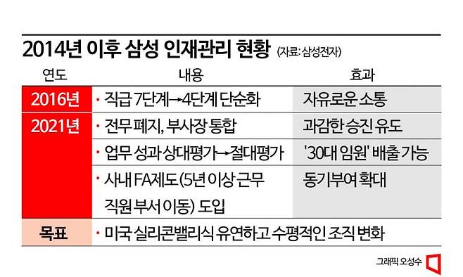 이재용 회장은 2016년, 2021년 인사제도 개편을 단행했다. 핵심은 연공서열을 타파하고 우수한 직원이라면 30대라도 임원으로 올릴 수 있도록 성과주의를 가다듬은 것이다. 2016년엔 직급 7단계(사원1·2·3-대리-과장-차장-부장)에서 4단계(CL1~CL4)로 단순화했다. 2021년엔 전무를 폐지하고 부사장으로 통합했다. 업무 성과 평가 방식을 상대평가에서 절대평가로 바꿨다. 한 부서에서 5년 이상 근무한 직원에게 부서 이동할 기회를 주는 '사내 FA 제도'를 신설했다. 연봉 인상 체계는 바꾸지 않았다.