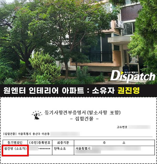 원엔터는 지난 2014년 이촌동 A아파트 인테리어 공사비를 지출했다. 결제 대금은 약 1,200만 원. 해당 아파트 등기부등본을 확인한 결과, 소유주는 권진영이었다.