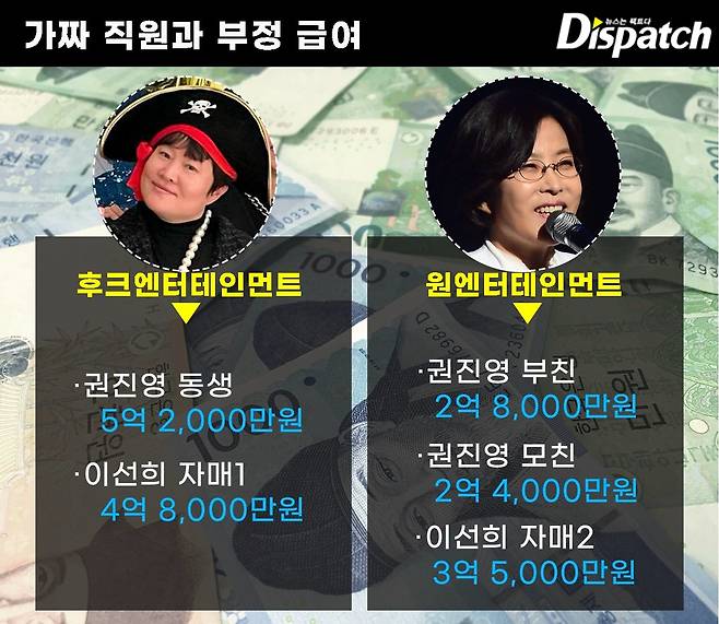 이선희는 그 돈을 자신의 자매, 권진영의 부친, 모친 등에게 알차게 나눠줬다. 원엔터는 이들 3명을 정직원으로 고용, 8년간 9억 원의 급여를 부정하게 지급했다.
