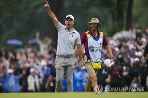 , of Canada, celebrates after winning the Canadian Open golf tournament in Toronto, Sunday, June 11, 2023. (Andrew Lahodynskyj/The Canadian Press via AP) MANDATORY CREDIT
