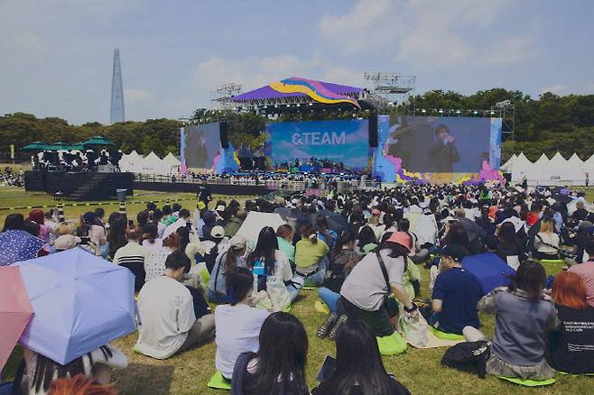 하이브가 처음 시도한 야외 음악 페스티벌 ‘2023 위버스콘 페스티벌’에서 펼쳐진 풍경이다. 앞서 하이브는 레이블 소속 아티스트들을 총출동시킨 합동 공연 ‘뉴 이어스 이브 라이브’와 ‘위버스콘’을 선보인 바 있다. 이번엔 팬들에게 보다 다채로운 경험을 제공하기 위해 공연을 음악 페스티벌 형식으로 확장했다.