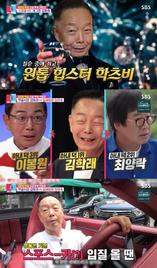 그러자 김학래는 "거의 80%는 와이프가 사주는 거다"며 "경제권을 가지고 있다. 스포츠카를 타고 싶으면 차분하게 '차 세 번 바꾸면 내 인생도 피니시 되겠다'고 한다"고 말해 웃음을 자아냈다.