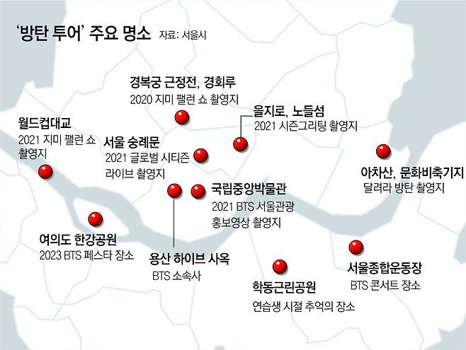 서울시가 방탄소년단(BTS) 데뷔(2013년 6월 13일) 10주년을 맞아 ‘서울방탄투어’ 지도를 제작했다고 12일 밝혔다.