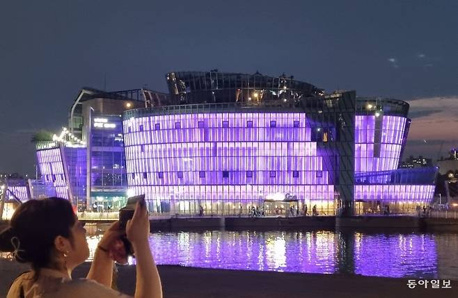 보랏빛으로 물든 세빛섬 방탄소년단(BTS) 데뷔 10주년(13일)을 하루 앞둔 12일 서울 서초구 반포한강공원 세빛섬이 BTS 팬클럽 ‘아미(ARMY)’의 상징색인 보랏빛으로 물든 가운데 한 시민이 스마트폰으로 이를 촬영하고 있다. 세빛섬과 남산서울타워 등 서울 랜드마크 8곳은 이날부터 25일까지 저녁마다 보라색 조명을 밝힐 예정이다. 김재명 기자 base@donga.com