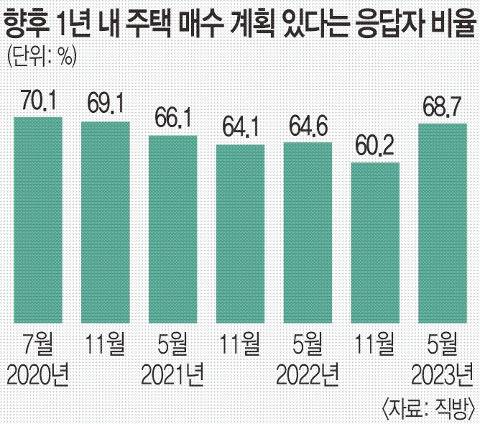 앞으로 1년 안에 집을 사겠다는 응답자 비율이 70%에 육박하며 2년 반 만에 최고치를 기록했다. 내 집을 마련하겠다는 사람과 시세 차익을 위해 투자하겠다는 사람 모두 늘었다.