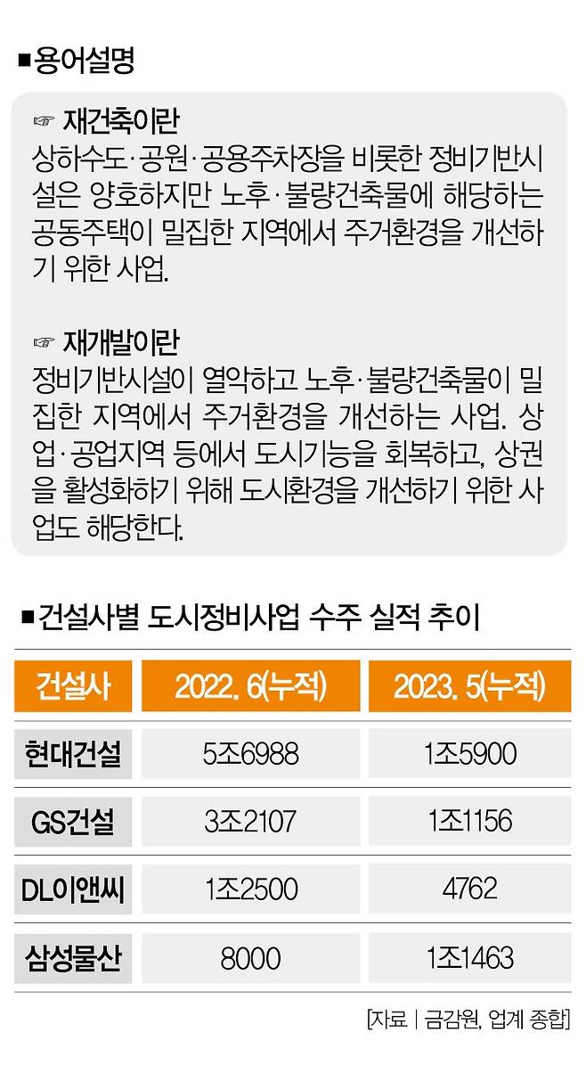 재건축ㆍ재개발 등 도시정비사업은 건설사 입장에선 거대한 분야다. 몇몇 건설사는 도시정비사업에서만 1년에 수조원대 수주 기록을 세우기도 했다. 올해는 사정이 다르다. 정부가 규제까지 해제하며 민간 부동산 시장을 활성화하려고 애쓰고 있지만, 건설사들은 쉽게 시장에 뛰어들지 않고 있다.