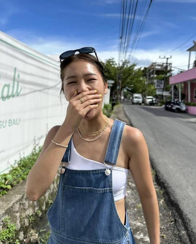 미미의 힙한 오버올 패션! 오버올에 이너로 화이트 컬러의 튜브톱을 매치해 시원한 바캉스 룩을 선보였어요. 어디론가 훌쩍 떠나고 싶어지는 룩이죠?