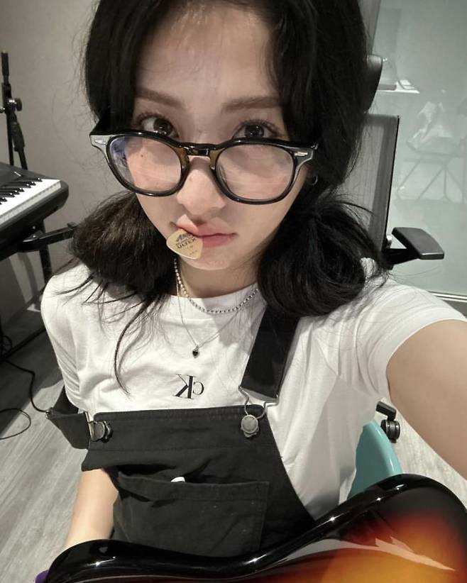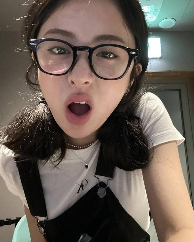 블랙 오버올에 CK로고가 돋보이는 티셔츠를 매치해 귀엽고 힙한 패션을 선보인 허윤진. 상큼한 양갈래 머리까지 완벽한 오버올 스타일링이에요.