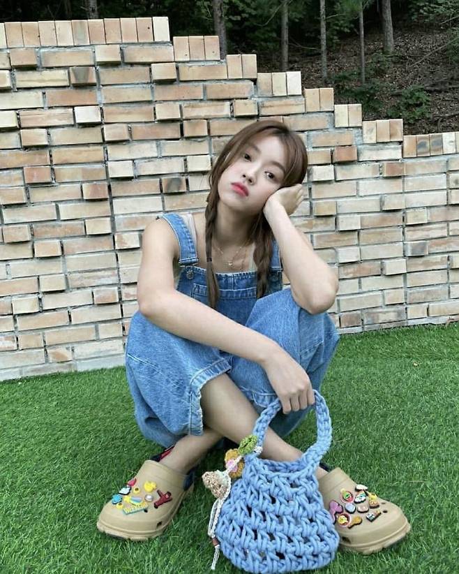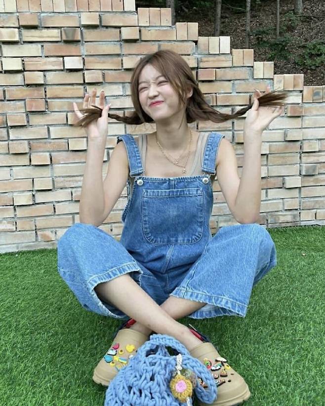 데님 오버올에 크록스를 매치해 상큼하고 편안한 룩을 보여준 유아. 양 갈래로 땋은 머리까지 귀여운 오버올 패션입니다.