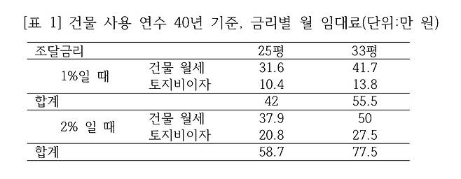 | ▲ 건물 사용 연수 40년 기준, 금리별 월 임대료 |