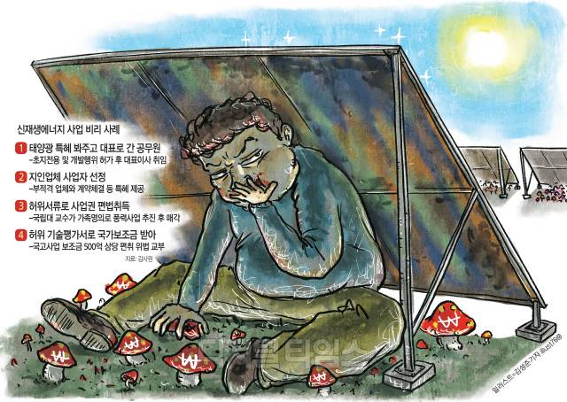 감사원은 13일 작년 10월부터 진행한 '신재생에너지 사업 추진 실태' 감사 결과를 발표했다. 감사에서 신재생 사업과 밀접한 기관의 공직자와 자치단체장 등이 민간업체와 공모해 인허가 과정이나 계약에서 특혜를 제공한 사례가 적발됐다. 또 허위서류를 꾸며 사업권을 편법 취득하거나 국고 보조금을 부당하게 교부받은 사례 등도 확인됐다. 지난해 9월 국무조정실 점검에서도 수천건의 비리가 적발되는 등 태양광 사업이 비리의 복마전이라는 지적이 나온다.