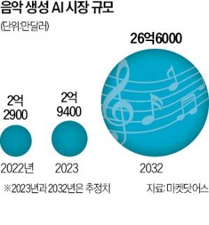 빅테크들이 음악 생성 시장에 눈독을 들이는 것은 수익 실현이 용이하다고 판단해서다. 시장분석업체 마켓닷어스에 따르면 세계 음악 생성 AI 시장 규모는 지난해 2억2900만달러(약 2900억원)에서 10년 뒤인 2032년 26억6000만달러(약 3조3800억원)로 11배 이상 성장할 전망이다. 저작권 침해 문제에서 벗어날 수 있는 배경음악에 대한 수요가 급증하고 있다는 점을 감안한 예측치다.