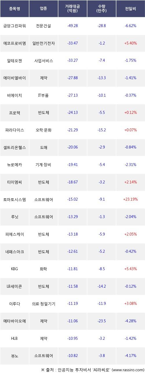 기관 투자자의 순매도 상위 20개 종목은 금양그린파워, 에코프로비엠, 알테오젠, 에이비엘바이오, 비에이치, 프로텍, 파라다이스, 셀트리온헬스케어, 뉴로메카, 티이엠씨등이다.