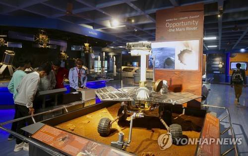 epa10688067 Visitors look at the Full-Scale Replica of the Mars Rover Opportunity operated on Mars displayed at Visvesvaraya Industrial and Technological Museum (VITM) in Bangalore, India, 13 June 2023. Mars Rover Opportunity was the second of the two rovers launched by NASA in 2003 to land on Mars and begin traversing the Red Planet in search of signs of ancient water. The Opportunity rover explored the Martian terrain for almost 15 years and it sent thousands of pictures to its control station. EPA/JAGADEESH NV