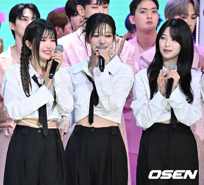 그룹 프로미스나인(fromis_9)이 더쇼 1위를 한 후 송하영, 이채영, 백지헌이 눈물을 흘리고 있다. 2023.06.13 /rumi@osen.co.kr