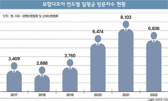 보험다모아의 2022년 일평균 방문자 수는 6836명으로 5년 전인 2017년(3409명) 대비 2배 이상 늘긴 했지만 전년(8103명) 대비 15.64%(1267명) 줄었다. 연도별 일평균 방문자수는 ▲2017년 3409명 ▲2018년 2888명 ▲2019년 3760명 ▲2020년 6474년 ▲2021년 8103명 ▲2022년 6836명으로 변동폭이 크다. 지난 2월말 기준 누적 방문자수는 1309만5857명이다.