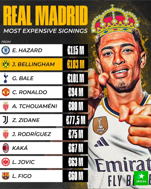 유럽축구전문매체 '스코어스'는 벨링엄의 이적에 맞춰 레알 역대 이적료 상위 10명을 공개했다. 1위는 에덴 아자르로 1억 1,500만 유로(약 1,592억 원)였다. 벨링엄이 그 뒤를 이었고 3위는 가레스 베일의 1억 100만 유로(약 1,398억 원)였다.