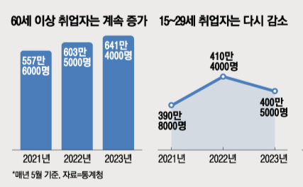 실제로 60세 이상 취업자는 빠르게 늘고 있다. 2021년 5월 557만6000명이었던 60세 이상 취업자는 지난해 5월 603만5000명에 이어 올해 5월에는 641만4000명까지 치솟았다. 반대로 15~29세 취업자는 그 수 자체도 고령층보다 작을뿐더러 최근 감소세를 보이고 있다. 15~29세 취업자는 2021년 5월 390만8000명에서 지난해 5월 410만4000명으로 소폭 늘었지만 올해 5월 400만5000명으로 줄었다.