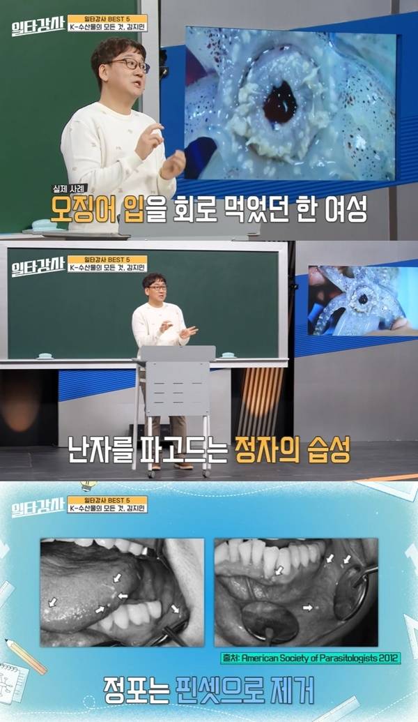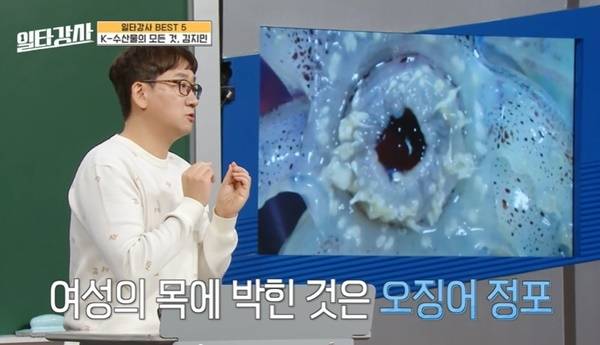 김지민은 강의에서 총알오징어가 일반 오징어의 새끼를 뜻한다는 사실에 더해 오징어 입을 회로 먹을 때 주의해야 할 점을 말했다.