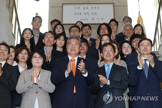 (서울=연합뉴스) 박동주 기자 = 박진 외교부 장관과 박철희 국립외교원장 등이 15일 오전 서울 서초구 국립외교원에서 열린 국립외교원 설립 60주년 기념 대통령 친필 휘호 제막식에서 기념촬영을 하고 있다. 2023.6.15