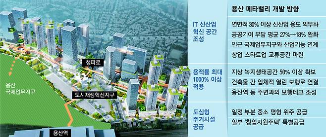 시 관계자는 “미래 산업 구조가 AI, 가상현실(VR), 확장현실(XR), 메타버스 위주로 재편되고 있는 만큼 이에 맞는 공간을 확보하겠다는 것”이라며 “국제업무지구에 들어설 글로벌 기업과 용산전자상가의 스타트업을 매칭해 미래산업의 창업 요람으로 삼겠다”고 강조했다.