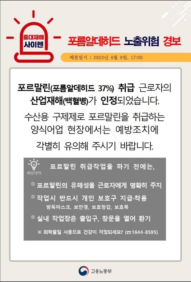 우선 양식자 노동자들에 대한 안전 교육을 강화하기로 했습니다. 이달 안에 기존의 '수산물 양식어업 종사자의 안전보건가이드'에 수산용 포르말린에 대한 부분을 보강해 전국 노동관서와 양식업 종사자들에게 배포하고 교육 자료 등으로 활용할 계획입니다. 또 지난 9일에는 카카오톡 중대 재해 동향 알림방인 '중대재해 사이렌'을 통해 포름알데히드 노출위험 경보를 하고, 수산용 구제제로 포르말린을 취급하는 양식어업 현장에서는 예방 조치에 각별히 유의할 것을 당부했습니다.