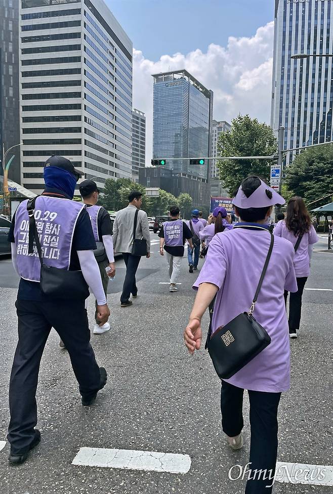지난 8일 시작한 릴레이 행진은 이태원 참사 희생자 분향소가 있는 시청광장에서 출발해 광화문, 마포대교를 거쳐 국민의힘 당사, 더불어민주당 당사를 지나 국회 앞에서 마무리 된다. 약 8.8km의 행진, 3시간여를 꼬박 걸어야 한다. 이태원 참사 유가족들은 이 길을 오는 7월 1일(주말 제외, 총 18일)까지 걷고 또 걸어, 총 159km 거리를 행진할 예정이다.