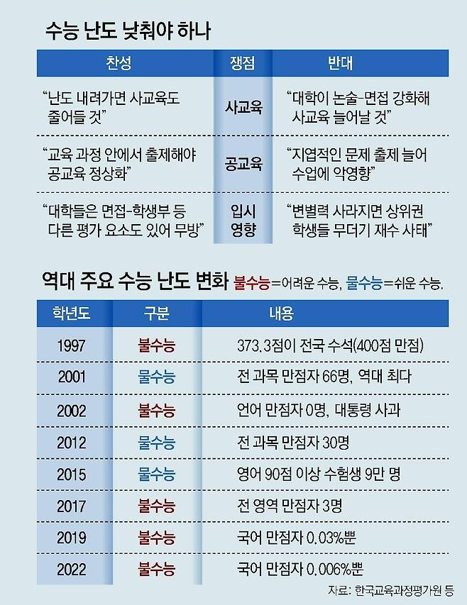 반면 수능 난도가 갑자기 낮아지면 혼란이 불가피할 것이라는 우려도 나왔다. 홍문표 성균관대 입학처장은 “쉬운 문제 위주로 출제되면 변별력이 떨어져 열심히 공부한 학생들이 오히려 손해를 볼 수 있다”고 말했다. 대학들이 상위권 학생을 변별하기 위해 논술, 면접을 강화할 가능성도 있다. 한 입시업체 관계자는 “이를 기화로 학원들이 ‘논술 면접을 준비해야 한다’며 오히려 사교육 마케팅에 나설 가능성도 있다”고 말했다. 임성호 종로학원 대표는 “수능 변별력이 약해지면 상위권 학생들이 대거 재수를 선택할 수도 있다”고 말했다.
