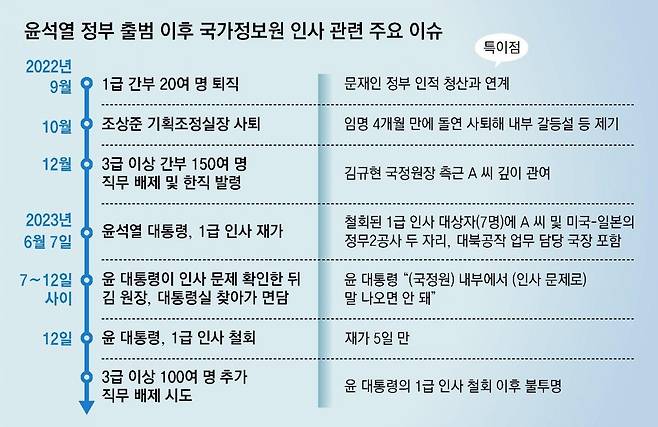 대규모 물갈이에 앞서 이달 국정원 1급 간부 7명에 대한 인사에 김 원장의 측근 A 씨가 과도하게 개입했다는 의혹에 윤석열 대통령이 재가 뒤 인사를 뒤집는 초유의 사태가 일어나자 인사 파동 책임 소재를 둘러싼 국정원 내부 충돌은 내전 수준으로 격화되고 있다. 인사가 철회된 보직에는 미국과 일본의 정보거점장인 정무2공사 두 자리, 대북공작 업무를 담당하는 국장이 포함됐다. 정보전쟁의 최전선인 미국과 일본, 북한의 핵심 보직 공백 사태가 벌어졌음에도 서로 책임 공방을 벌이며 혼란에 빠진 국정원에 대해 “이래선 안 된다”는 우려가 증폭되고 있다.