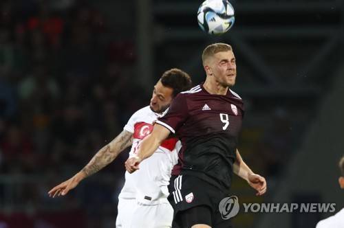 epa10695724 Vladislavs Gutkovskis (R) of Latvia and Umut Nayir of Turkey in action during the UEFA EURO 2024 Group D qualifying match between Latvia and Turkey in Riga, Latvia, 16 June 2023. EPA/TOMS KALNINS
