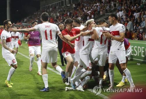 epa10695875 Players of Turkey celebrate winning the UEFA EURO 2024 Group D qualifying match between Latvia and Turkey in Riga, Latvia, 16 June 2023. EPA/TOMS KALNINS