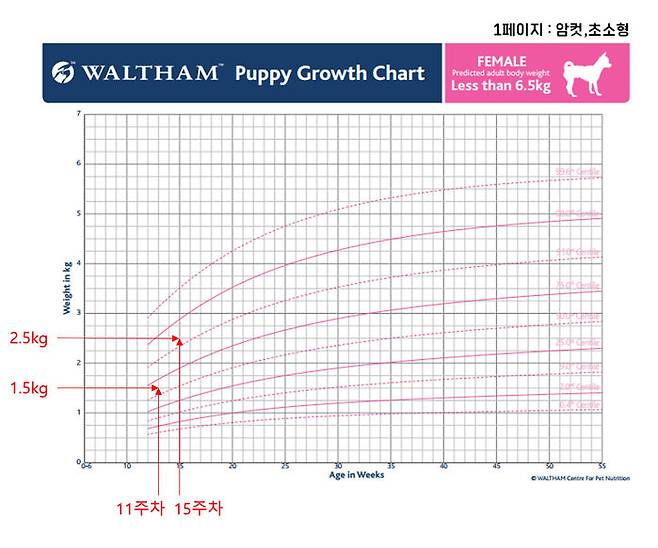미국에서 600만 마리의 어린 강아지를 대상으로 분석을 한 자료가 있습니다. 영국의 월섬연구소에서 이를 바탕으로 배포용 차트를 개발했습니다. 사실 이러한 분석은 여러분이 익히 아는 로얄캐닌을 갖고 있는 마즈라는 회사가 월섬연구소와 미국의 프랜차이즈 동물병원을 모두 소유하고 있는 덕분에 가능해졌습니다.