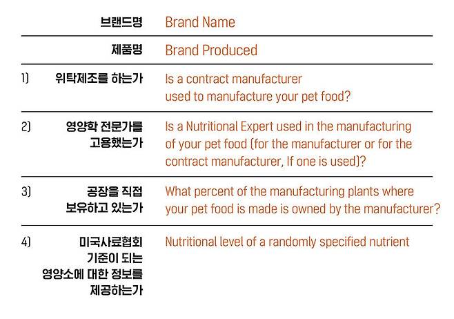 미국의 경우에는 일부 서비스 업체에서 위와 같은 리스트로 업체들에 개별질문을 하여 분석도 하였습니다. 그중 세계수의사회 위원이며, 미국 수의 영양 전문의로 터프츠대학 교수로 있는 'Lisa M. Freeman 선생님'이 직접 조사에 참여한 서비스도 있습니다. (▶ 2023년 기준 보고서 보러 가기)