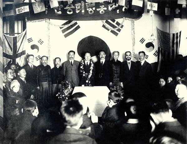 | ▲ 1920년 12월 28일 상해 교민단 주최로 열린 이승만 대통령 환영회 사진. 왼쪽부터 손정도, 이동녕, 이시영, 이동휘, 이승만, 안창호, 박은식, 신규식. |