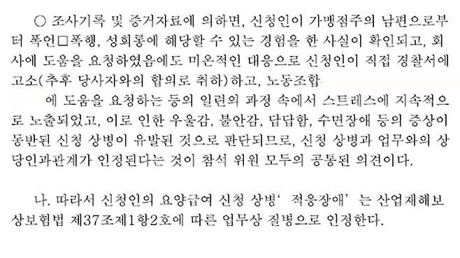 박대수 의원실 윤창혁 선임비서관의 도움을 받아 해당 산재 판정문을 구해봤습니다. 판정문에는 A 씨가 가맹점주의 괴롭힘 발생 뒤 겪었을 스트레스에 대해 설명하고 있습니다. 주목할 부분은 가맹점주의 괴롭힘을 인정한 점 말고도 더 있습니다. A 씨의 회사 대처에도 문제가 있다는 점입니다. 판정문에는 "회사에 도움을 요청하였음에도 미온적인 대응으로 신청인이 직접 경찰서에 고소하고, 노동조합에 도움을 요청하는 등의 일련의 과정 속에서 스트레스에 지속적으로 노출됐다"라고 기재돼 있습니다. 무슨 의미일까요? 그만큼 '제3자 괴롭힘'이 발생했을 때 사측이 제대로 된 대응을 하지 못해 A 씨가 질병을 얻었다는 의미입니다. 이처럼 제3자 괴롭힘은 산재 영역에서는 갈수록 인정 범위가 넓어지고 있는 추세입니다. 다음 과제는 제3자 괴롭힘을 근로기준법상 직장 내 괴롭힘 범주에 포함시키는 것입니다. 국회 환경노동위원회 위원들의 활약을 기대합니다.