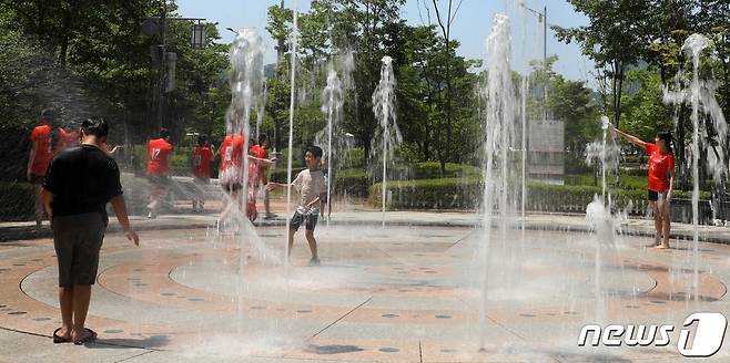 (전주=뉴스1) 유경석 기자 = 전국 곳곳에 폭염특보가 내려진 18일 전북 전주시 마전숲공원 분수대를 찾은 어린이들이 물놀이를 즐기고 있다. 2023.6.18/뉴스1