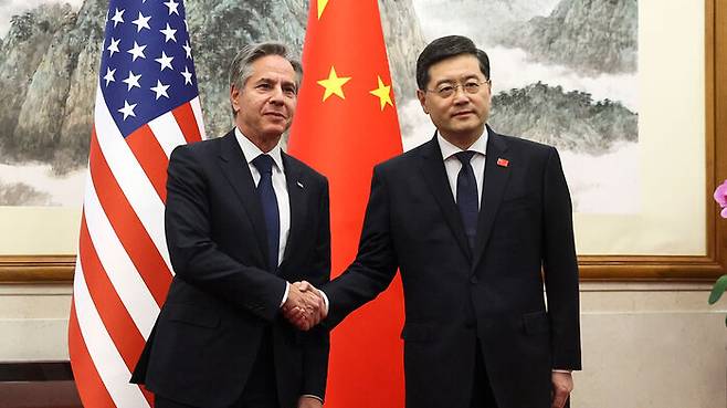 블링컨 미 국무장관과 친강 중국 국무위원 겸 외교부장은 현지시간 오늘 오후 2시 반 베이징 댜오위타이 국빈관에서 회담을 진행했습니다.