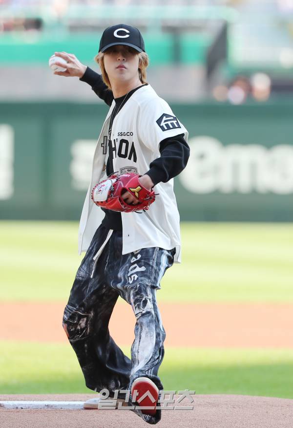 경기 전 시구자로 나온 빅나티가 마운드에서 공을 던지고 있다.
