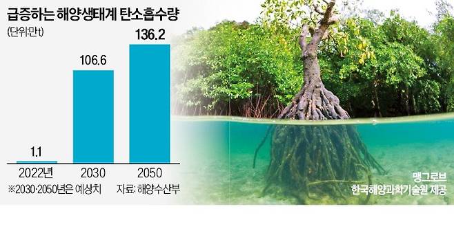 김종성 서울대 지구환경과학부 교수 연구에 따르면 맹그로브의 북방한계선은 북위 33도 38분까지 올라왔다. 일본 규슈섬 남부 지역이다. 제주도 남해안 일대와 위도가 겹친다. 김 교수는 “조만간 맹그로브가 제주도를 넘어 한반도 남해안에 상륙할 것으로 예측된다”고 했다. 이에 정부는 맹그로브 등을 포함한 바다숲을 적극 조성할 계획이다. 해양생태계에 의한 탄소흡수량을 작년 대비 100배 이상 많은 106만t(2030년)으로 늘리는 것이 목표다.