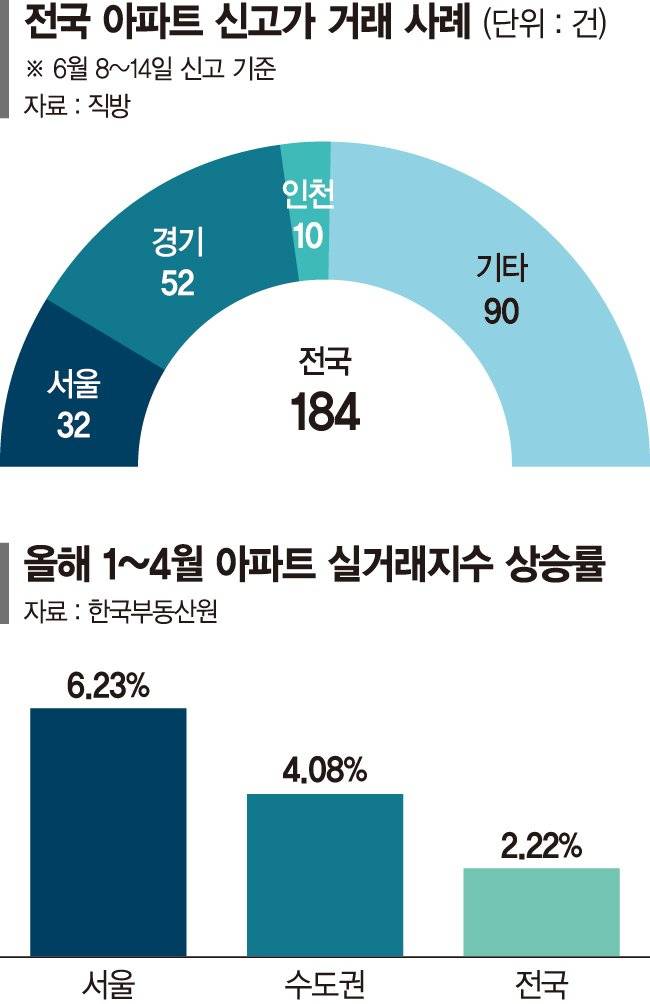 18일 파이낸셜뉴스가 직방에 의뢰해 최근 1주일간(6월 8~14일) 국토교통부 실거래가시스템에 신고된 아파트 매매거래를 분석한 결과 전국에서 184건이 신고가를 경신한 것으로 조사됐다.
