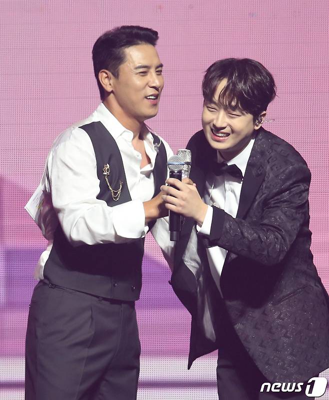 (서울=뉴스1) 권현진 기자 = 가수 장민호와 이찬원(오른쪽)이 18일 서울 송파구 올림픽공원 KSPO DOME에서 열린 ‘제32회 롯데면세점 패밀리 콘서트’(이하 ‘롯데 콘서트’)에서 인사를 나누고 있다.