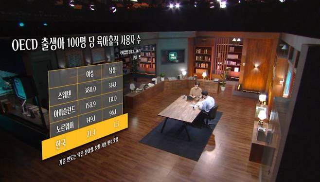 자료를 보면 한국은 출생아 100명당 여성 21.4명, 남성 1.3명이 육아휴직을 사용했다고 나와 있습니다. 정보가 공개된 OECD 19개국 가운데 가장 낮은 수치를 기록하고 있습니다.