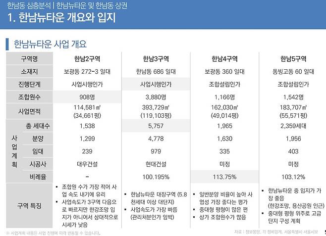 한남뉴타운은 2003년 뉴타운으로 지정됐다. 5개 구역 중 구역해제된 1구역을 제외한 한남 2~5구역에서 재개발 사업이 진행 중이다.