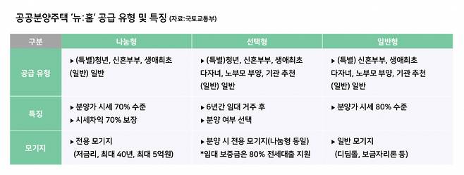 다만 유형이 다소 복잡해진 측면이 있어, 꼼꼼한 확인이 필요하다. 가령 이달 청약을 함께 진행하는 수방사와 남양주 왕숙‧안양 매곡 특공 중 수방사는 '일반형'이고 나머지는 '나눔형'이다. 뉴:홈은 분양가 수준과 금융 지원 방식 등에 따라 청약 유형을 나눔형과 일반형, 선택형 등 3가지 유형으로 구분한다. 각 유형별 특별‧일반공급 비율이 다르고 청약 자격별 조건도 다르다.