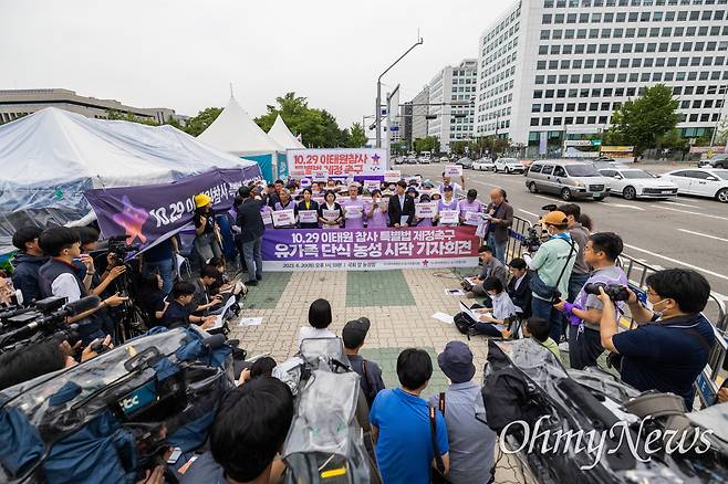 | ▲ 이태원참사 유가족들과 야당 의원 등이 20일 오후 서울 여의도 국회 앞에서 '이태원 참사 특별법' 제정촉구 유가족 단식 농성 시작 기자회견 하고 있다. 이날 참석한 의원은 더불어민주당 진성준, 남인순, 정의당 장혜영, 기본소득당 용혜인, 진보당 강성희 의원이 참석했다. |