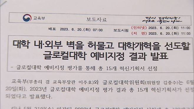 ◀앵커▶정부가 5년간 천억 원을 지원하는 글로컬 대학 예비 지정 결과를 발표했습니다.